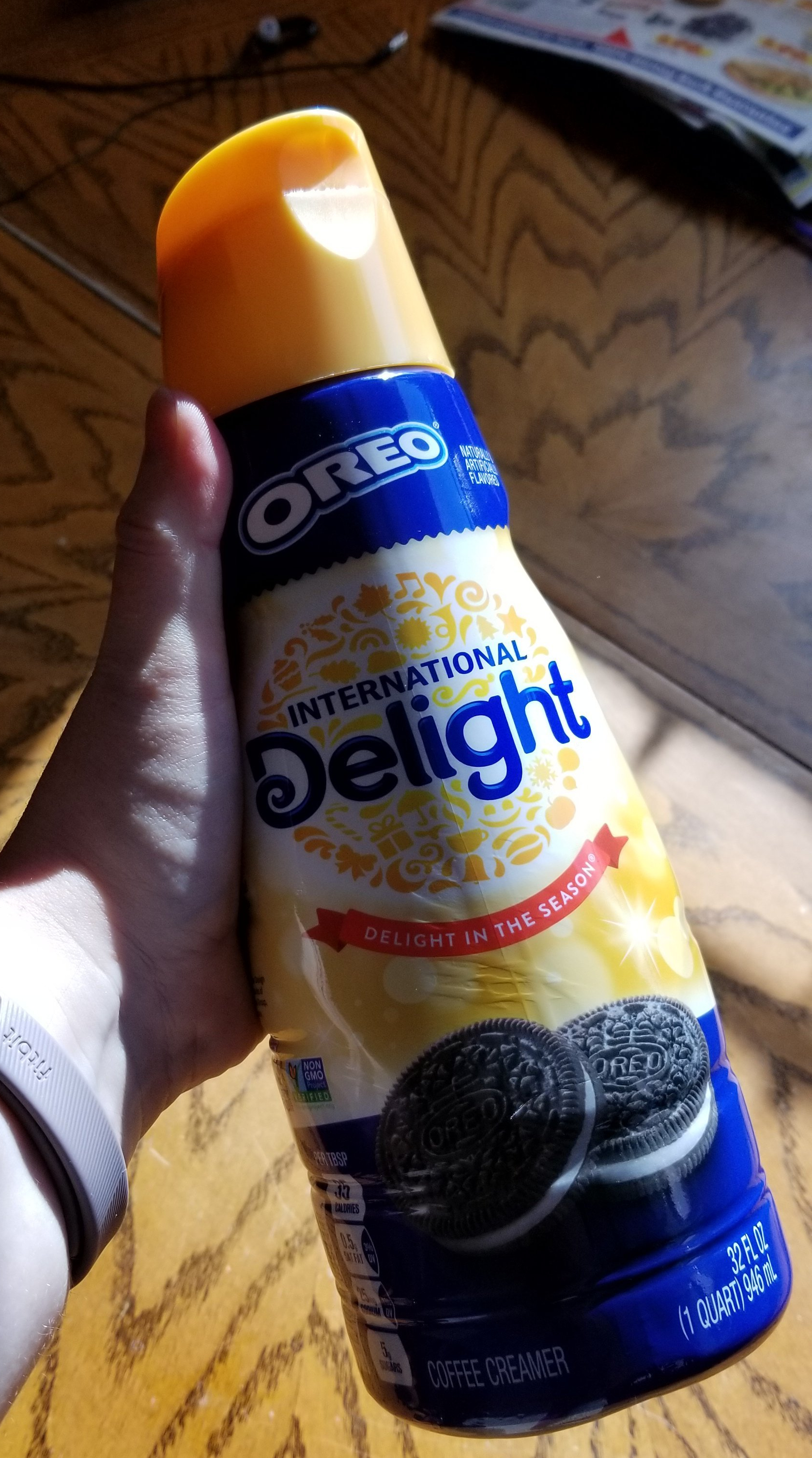 Just as reach for the sweet cream, I see a familiar label out of the corner of my eye. I turn my head and crane it to the side to get a better view, and lo and behold, there it was! The International Delight Oreo flavored creamer was back!