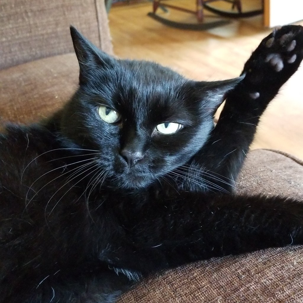 I had finally fallen asleep around 1-ish, when I woke to hear one of the cats consistently calling for one of the humans. The closeness of the call told me it was Spooky, since she often sleeps in my room. Thinking she had puked, and that I didn’t want to wake up for that yet, I called back to her and patted my bed. I could feel the mattress give slightly as she hopped up, but she was still mewing. This is something she normally does when she’s bored and wants attention, so I decided to stay quiet and let her settle on her own.